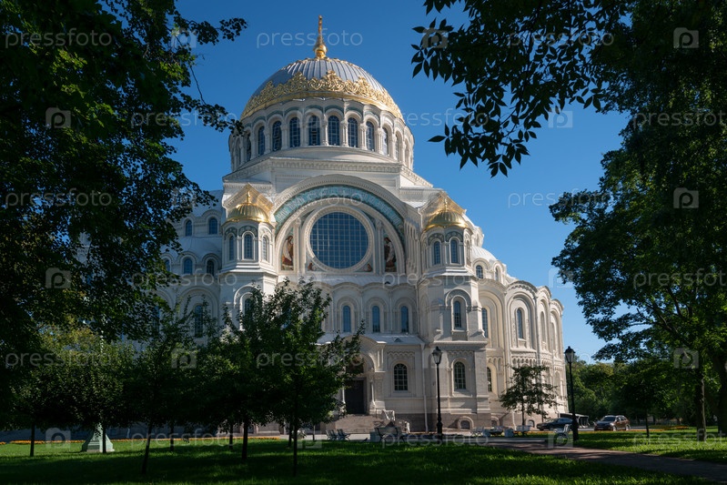 Морской собор Святого Николая в Кронштадте (Морской Никольский собор) и Якорная (Якорная) площадь солнечным летним утром, Кронштадт, Санкт-Петербург, Россия