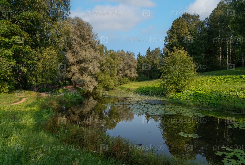 Река Славянка в Павловском дворцово-парковом комплексе в солнечный летний день, Павловск, Санкт-Петербург, Россия