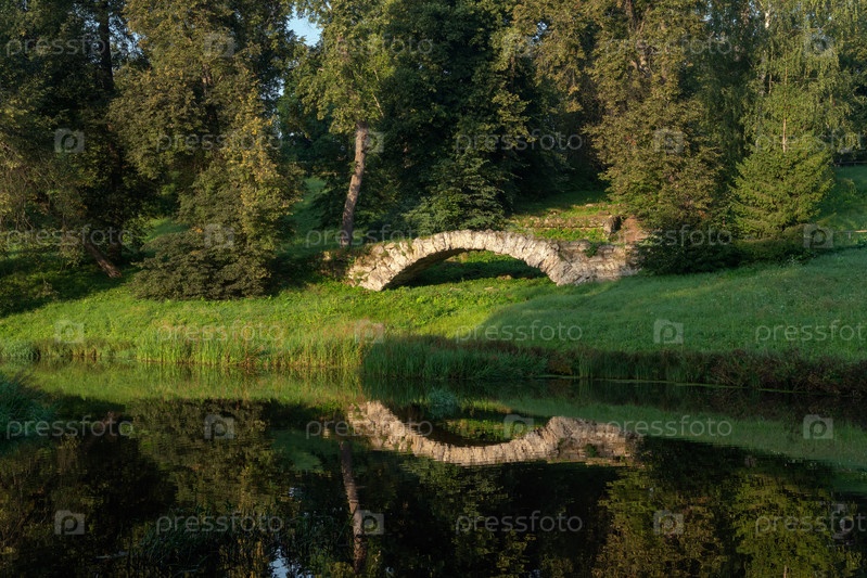 Вид на мост Аполлона на берегу Фасадного пруда на реке Славянка в Павловском парке в солнечный летний день, Павловск, Санкт-Петербург, Россия