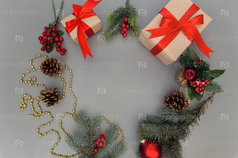 Рождественская граница с елкой и подарками на сером фоне. Шаблон поздравительной открытки с Рождеством и Новым годом