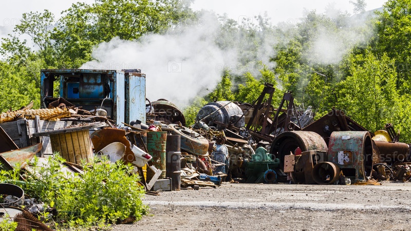 Незаконная свалка мусора. Большая куча металлических, деревянных и пластиковых отходов