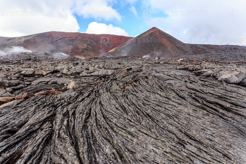 Сплошная лавовая равнина возле действующего вулкана Толбачик, Камчатка, Россия