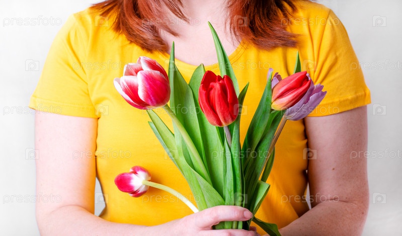 Букет тюльпанов в руках рыжей женщины в желтой футболке. Празднование Дня матери, Женского дня или дня рождения