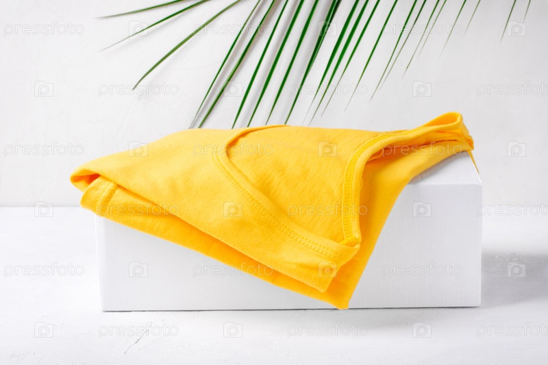Желтая футболка сложена на белом подиуме и пальмовом листе на заднем плане. Яркая летняя одежда