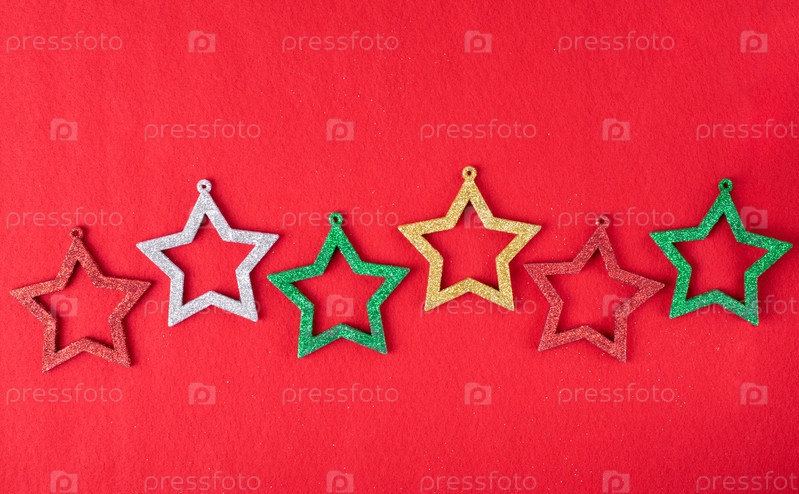 Разноцветные звезды на красном фоне. Плоская укладка. Новогодний или рождественский праздничный фон