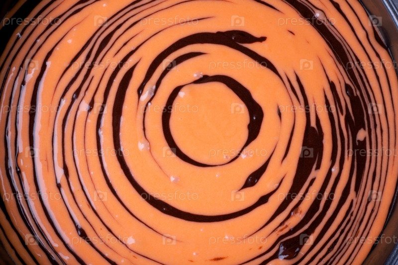 Тесто для торта тигрового цвета в форме для запекания. Вид сверху. Приготовление красочного десерта