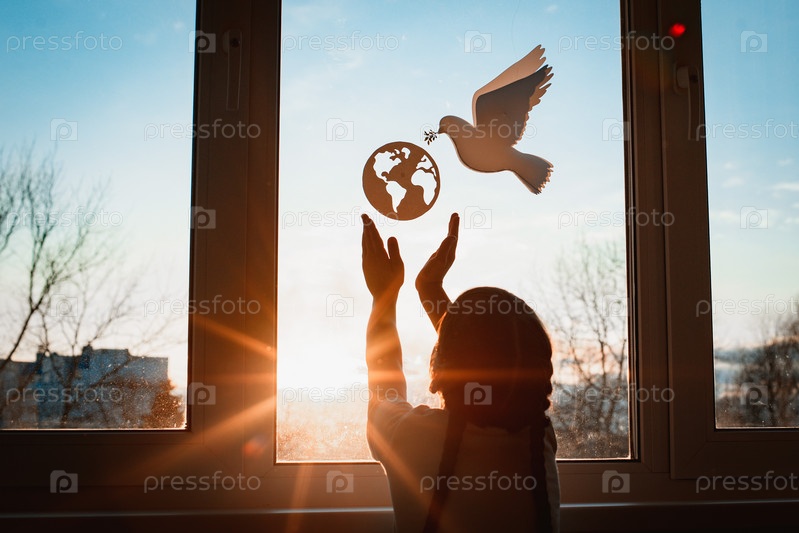 Ребенок протягивает руки солнечный свет закат за окном летит голубь мир с веткой силы глобус. концепция мира во всем мире, никакой войны, экология, защита планеты Земля, пацифизм