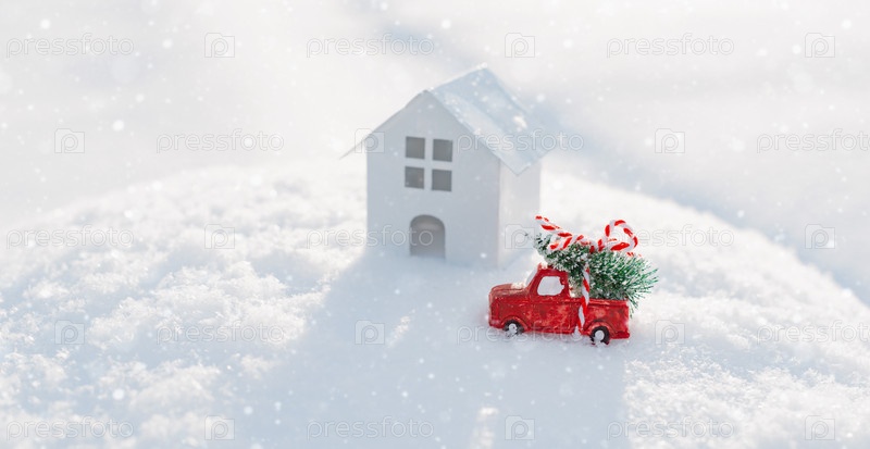 Новогодняя декоративная машина с елкой в снегу рядом с домом