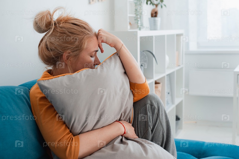 Несчастная одинокая депрессивная женщина дома, она сидит на диване, пряча подушку для лица, концепция депрессии астения