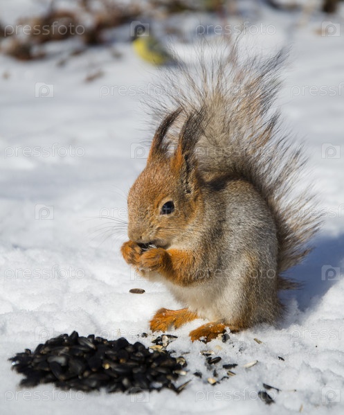 Рыжая пушистая белка ест семечки зимой