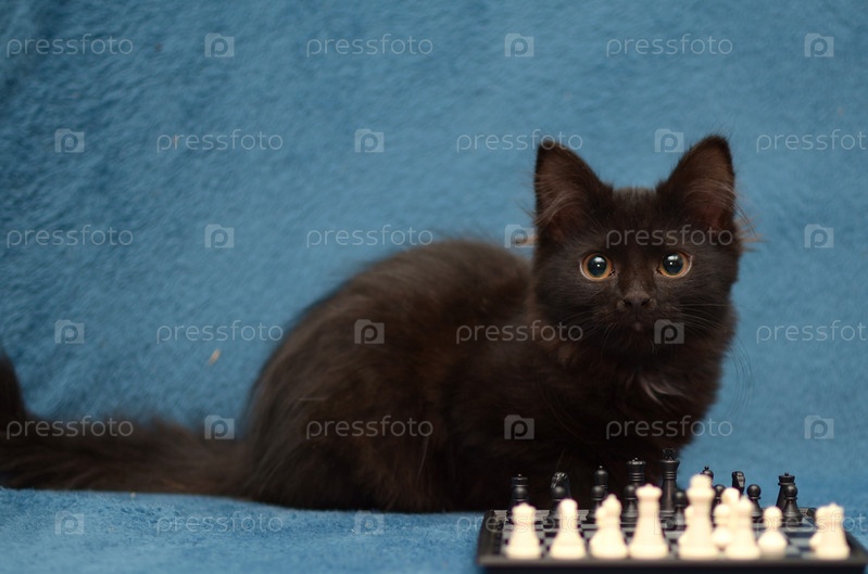 Кот играет в шахматы на голубом фоне