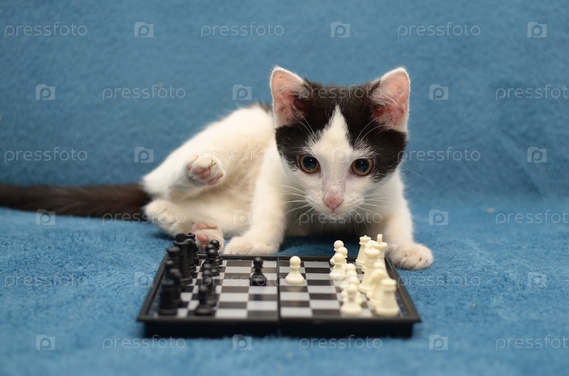 Кот играет в шахматы на голубом фоне