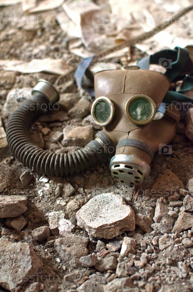 Противогаз лежит на разбитом каменном полу