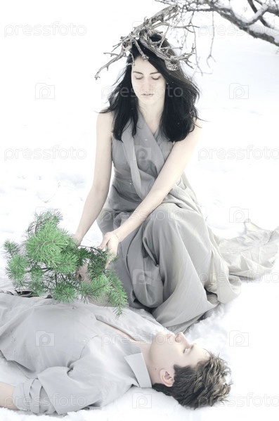 Женщина в костюме Снежной Королевы кладет сосновую ветку на лежащего снежного человека