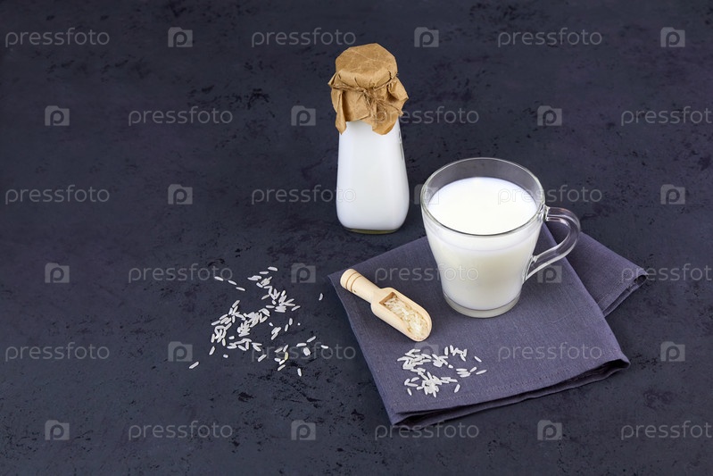 Рисовое молоко в стеклянной кружке и бутылке на темно-сером фоне