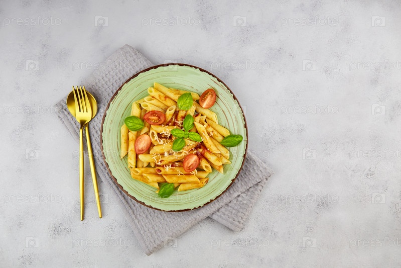 Паста пенне с помидорами и базиликом на сером фоне