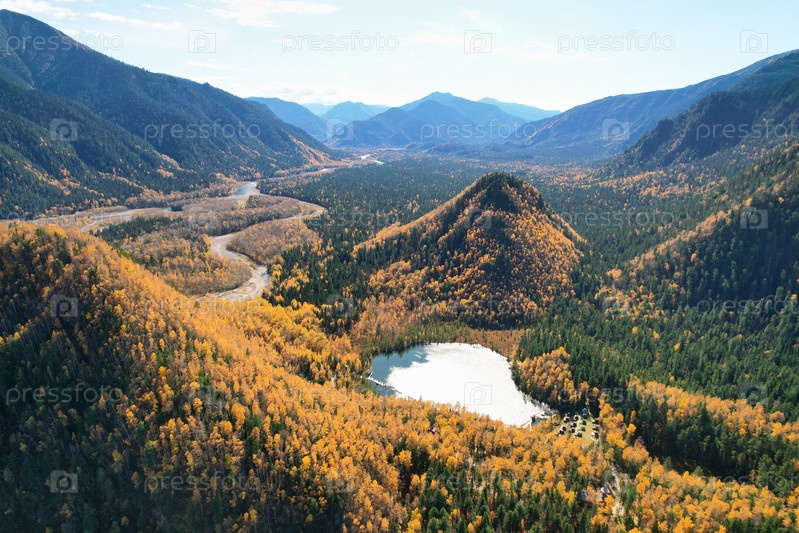 Красивый осенний пейзаж с воздуха. Озеро в осеннем лесу