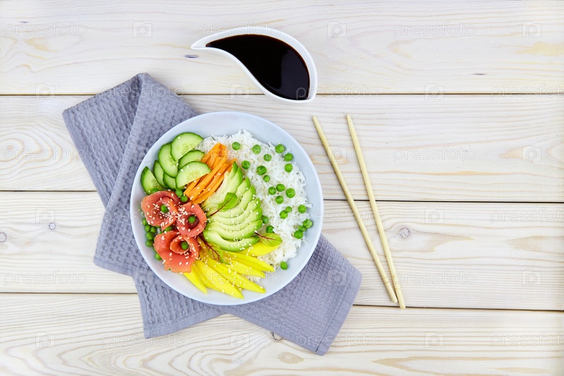 Поке боул с лососем, рисом, авокадо, огурцом, манго, микрогрином
