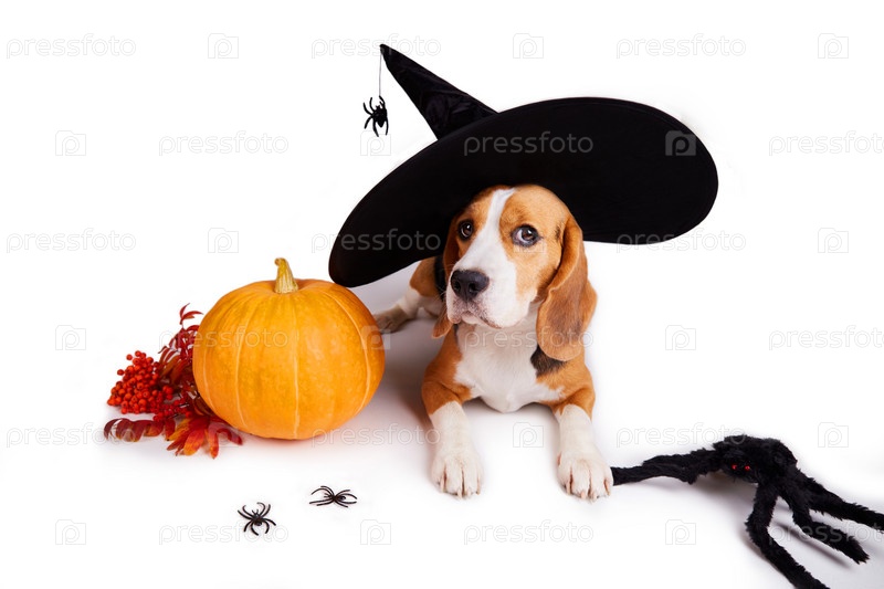 Собака-бигль в шляпе ведьмы лежит на белом изолированном фоне