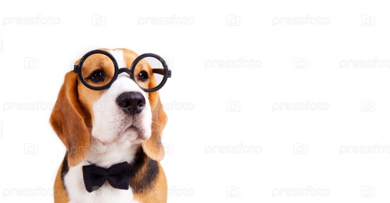 Собака-бигль в круглых очках на белом изолированном фоне