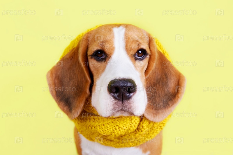 Собака-бигль в вязаном желтом шарфе или снуде на желтом изолированном фоне