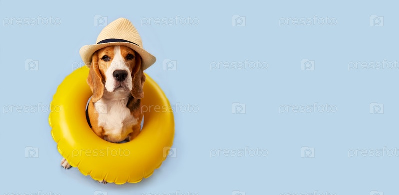 Собака-бигль в соломенной шляпе и плавательный круг на синем фоне
