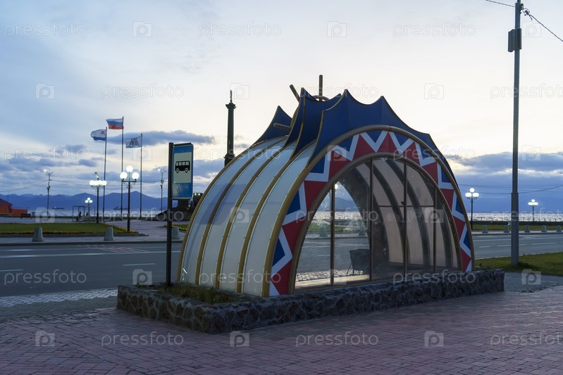 Петропавловск-Камчатский, Россия - 4 октября 2019 г.: Городской пейзаж с видом на дорогу и автобусную остановку