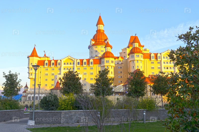Сочи, Россия-7 января 2018 г.: Пейзаж с видом на отель в сказочном стиле