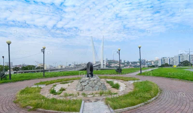 Владивосток, Приморский край - 3 сентября 2019 г.: Панорама городского пейзажа с видом на Золотой мост и скульптуру тигра