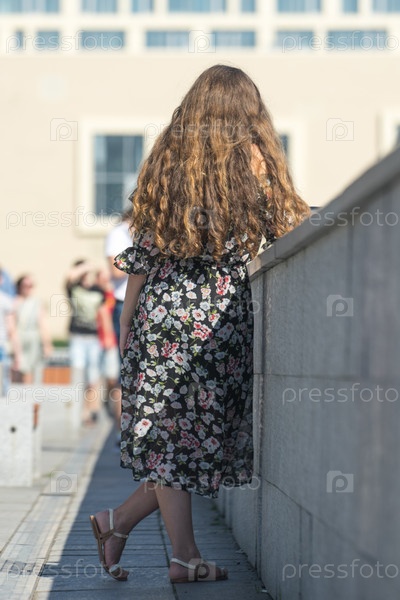 Девушка с красивыми длинными волосами стоит у серого забора