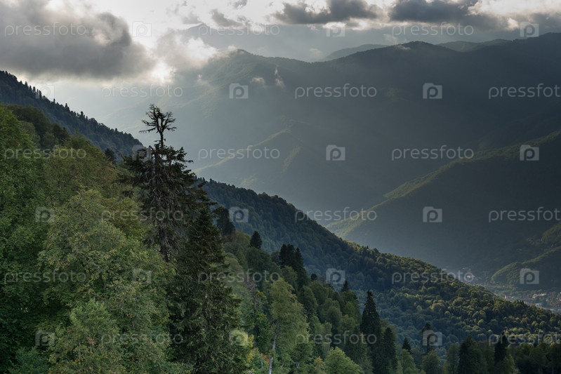 Горный пейзаж на фоне облачного неба и солнечных лучей