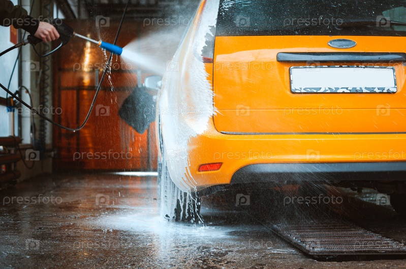Мойка желтого автомобиля на бесконтактной мойке самообслуживания. Мойка седана пеной и водой под высоким давлением. Весенняя уборка на автомойке