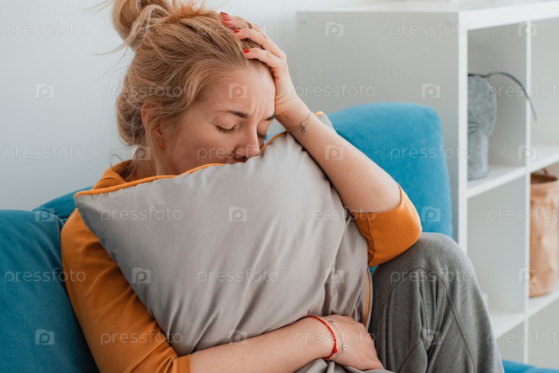 Несчастная одинокая депрессивная женщина дома, она сидит на диване, пряча подушку для лица, концепция депрессии