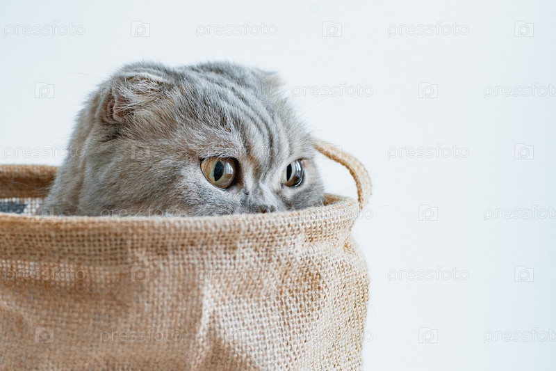 Полосатый серый озорной котенок хитро выглядывает из мешка глазами на белом фоне. Концепция неизвестного, вопрос, подделка, домашнее животное
