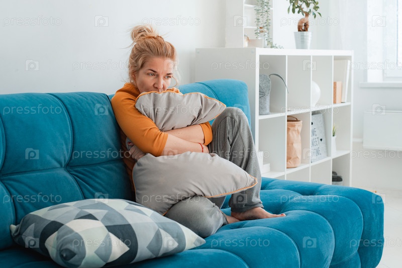 Несчастная одинокая депрессивная женщина дома, она сидит на диване, пряча подушку для лица, концепция депрессии