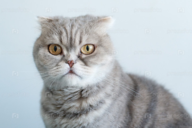 Красивый шотландский вислоухий серебристый полосатый портрет на белом фоне