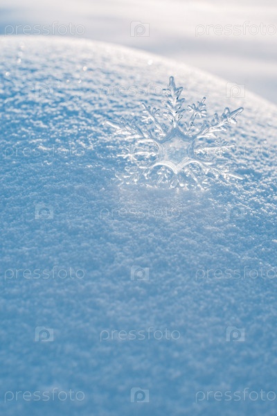 Красивый ледяной кристалл лежит в снегу и блестит на солнце, боке на синем фоне