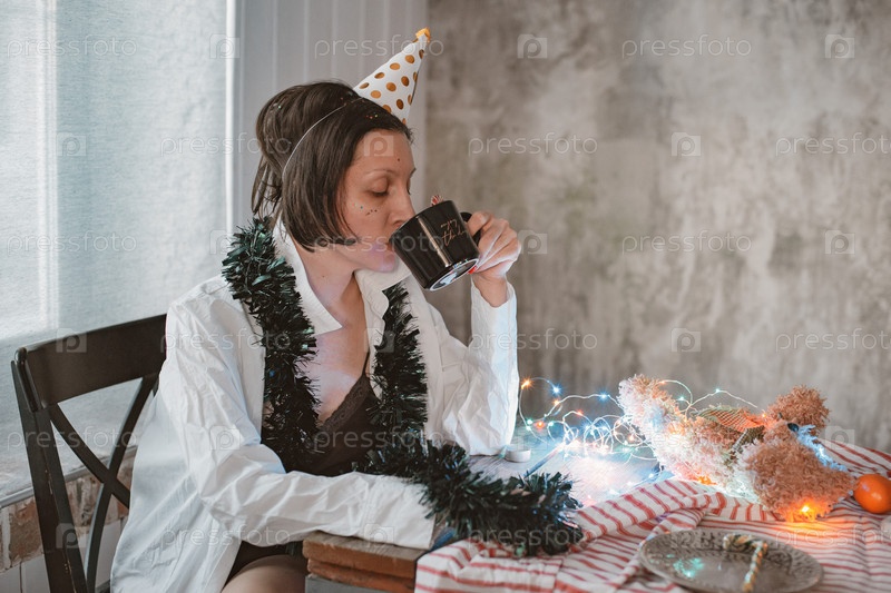 Усталая женщина в праздничной шляпе с похмельем и головной болью после празднования нового года дома