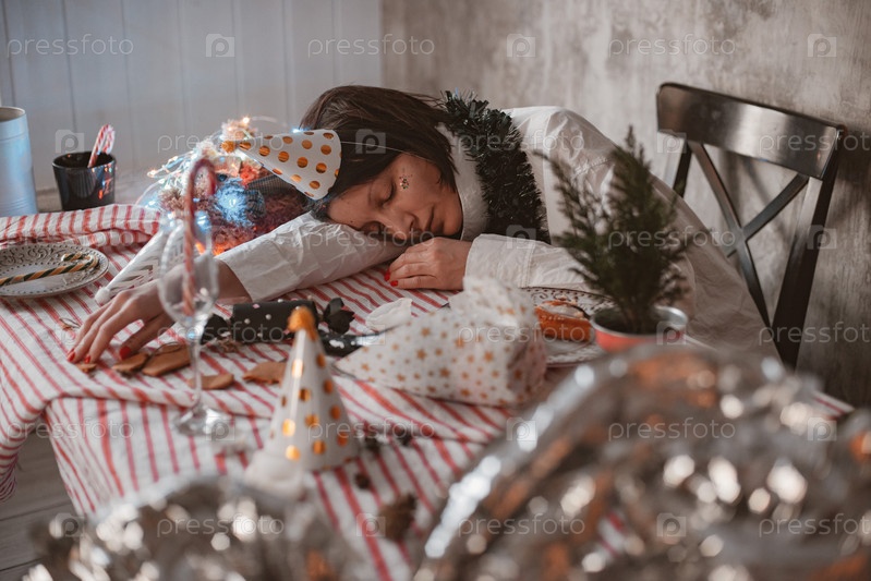 Вид сверху на расслабленную женщину в шляпе из конусной бумаги, мирно спящую с закрытыми глазами на неубранном праздничном столе, улыбающуюся во сне, женщину, отдыхающую после шумной новогодней вечеринки дома