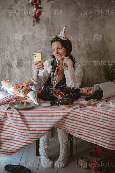 Депрессия после праздников. Усталая женщина делает селфи на мобильном телефоне, сидя за неубранным новогодним праздничным столом в уютной домашней одежде и вязаных белых носках. Послепраздничная депрессия