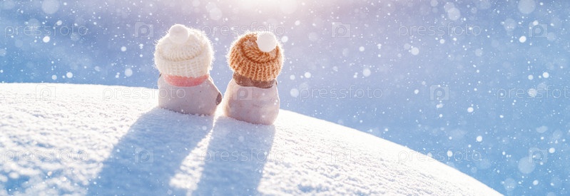 Рождественская открытка. Фигурка статуэтки двух снеговиков в шапочке на снежном фоне на открытом воздухе. Праздничный декор, теплый солнечный закат