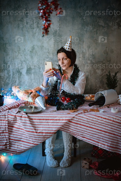 Депрессия после праздников. Усталая женщина делает селфи на мобильном телефоне, сидя за неубранным новогодним праздничным столом в уютной домашней одежде и вязаных белых носках. Послепраздничная депрессия