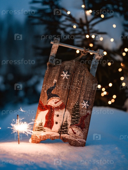 С Рождеством. Новогодняя открытка Бенгальский огонь в снегу вечером. деревянные декоративные санки с рисунком снеговика на снегу на открытом воздухе