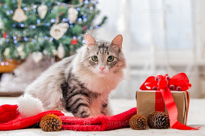 Рождественский кот. Портрет толстого пушистого кота рядом с подарочной коробкой на фоне елки и огней гирлянд
