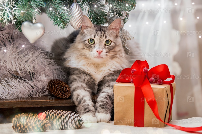 Рождественский кот. Портрет толстого пушистого кота рядом с подарочной коробкой на фоне елки и огней гирлянд