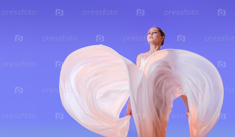 Портрет элегантной балерины в длинной развевающейся белой юбке на сиреневом светлом фоне