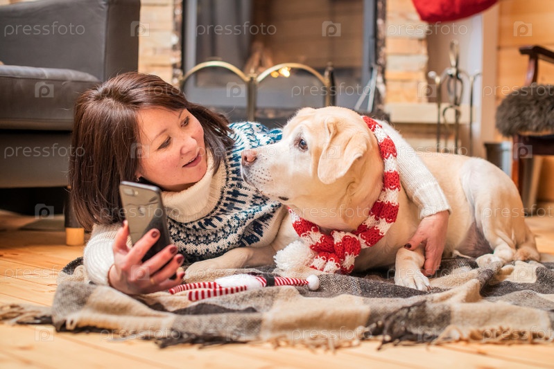 Золотистый лабрадор-ретривер в рождественском шарфе лежит с азиаткой средних лет на одеяле перед камином в загородном доме