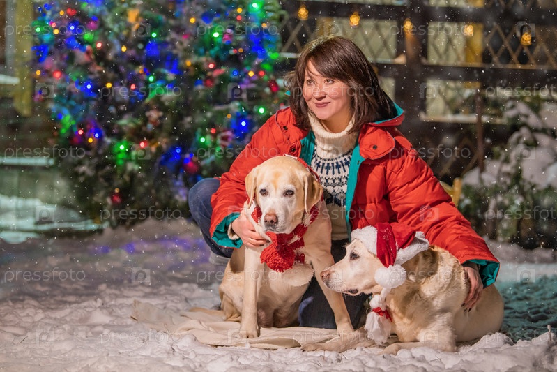 Женщина с золотым лабрадором в шарфе сидит возле украшенной елки и саней во время снегопада зимой во дворе жилого дома