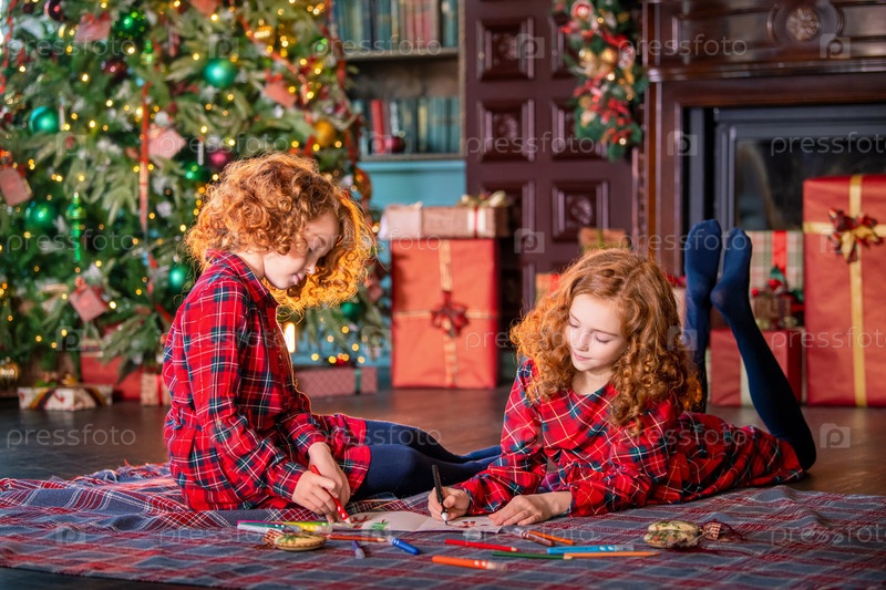 Две рыжеволосые кудрявые девушки пишут письмо Деду Морозу на фоне елки и украшенной комнаты