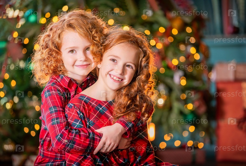 Портрет двух счастливых рыжеволосых кудрявых девушек, обнимающихся на фоне рождественской елки